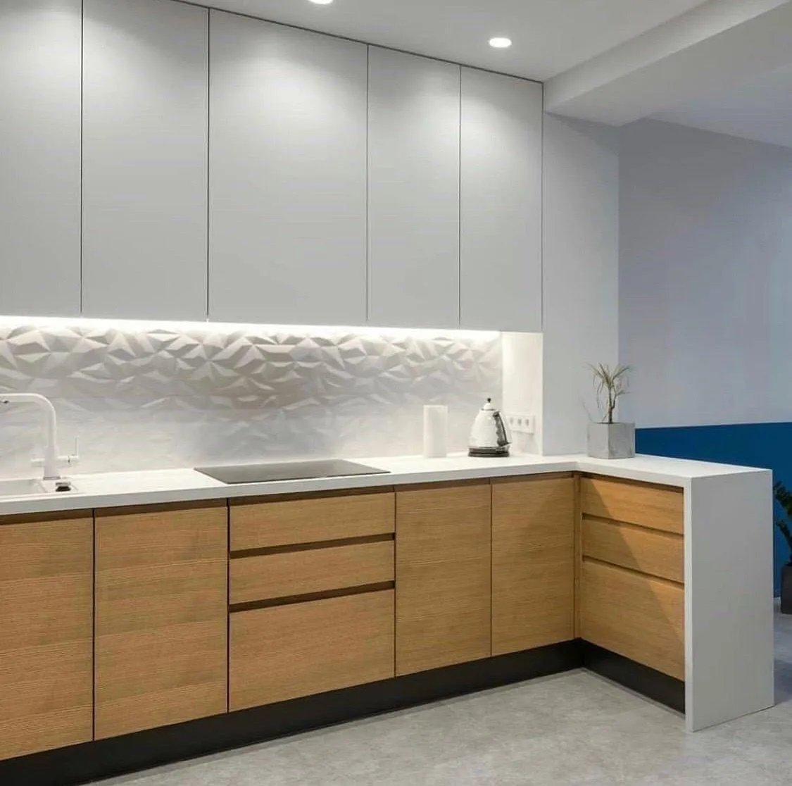- До білої кухні пасуватимуть відкриті полиці у кольорі дерева або контрастна стільниця чи скіналі.