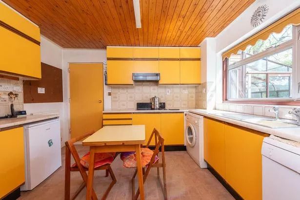 На фотографіях видно помаранчеві штори, які досі висять на вікнах їдальні, та геометричні килими, що вкривають підлогу. Старомодні меблі з твердого дуба теж вказують на недоторканість протягом багатьох років.
