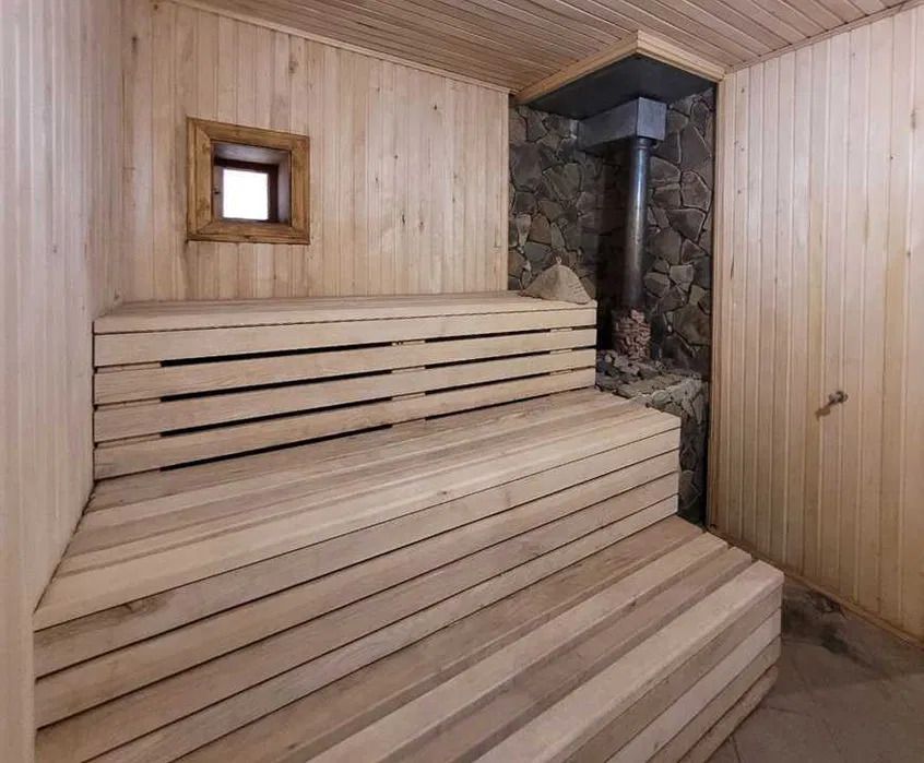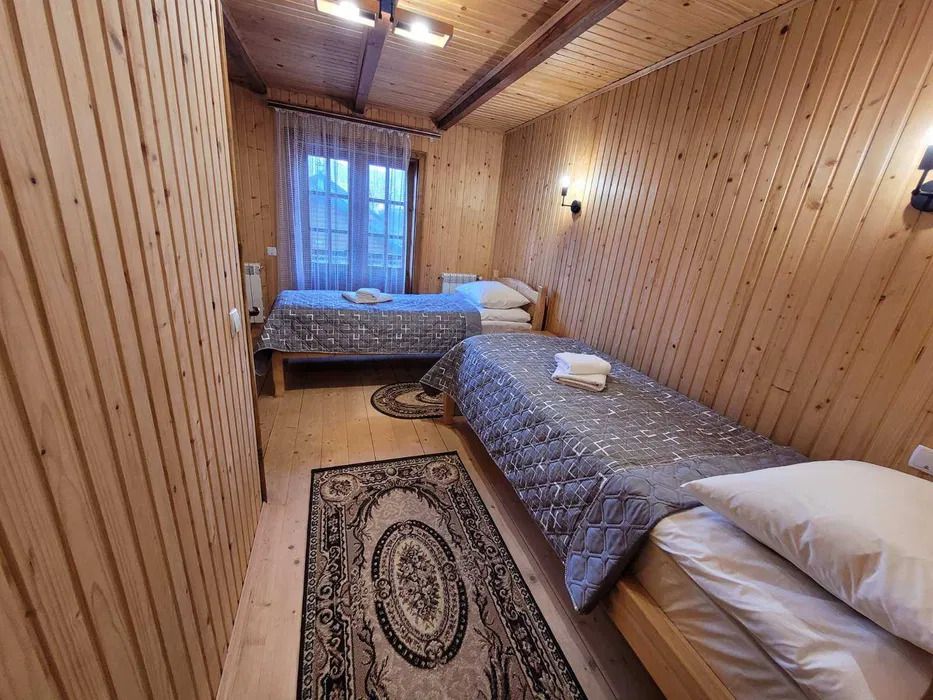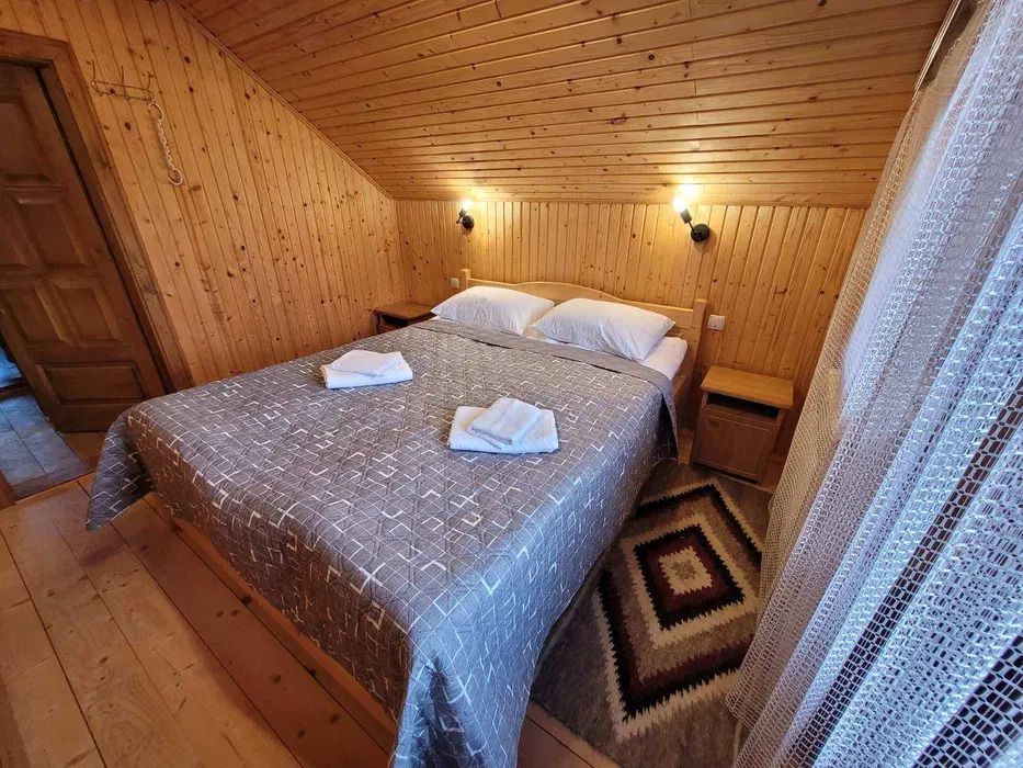 Двоповерховий будинок з п'ятьма спальнями використовували як готель з 10 – 12 спальними місцями. Загальна площа котеджу – 160 метрів квадратних. На першому поверсі є двомісна спальня, кухня з усією необхідною технікою, їдальня з каміном, санвузол і сауна на дровах. На другому поверсі – кілька спалень з балконами та ванна кімната.