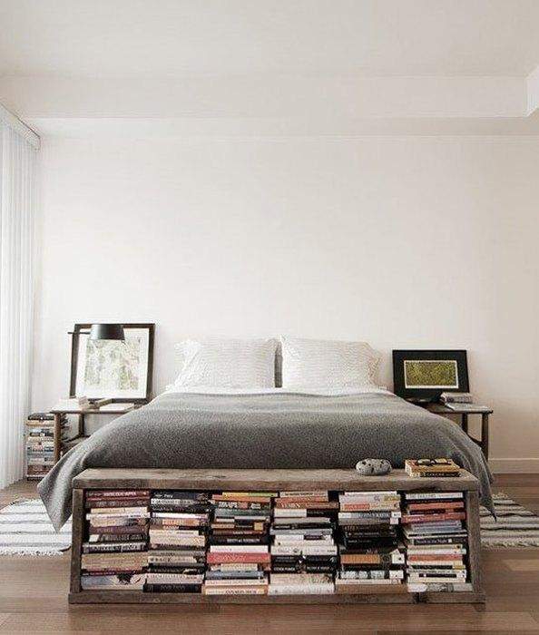 Спальня – не краще місце для зберігання книг. Якщо у вас немає можливості облаштувати книжкові стелажі в іншій кімнаті, зробіть для літератури закриту шафу. Її двері можуть бути зі скла, дерева або пластику.
