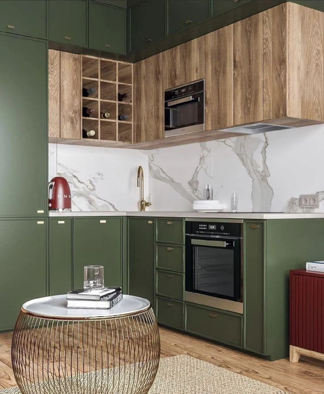 - Якщо не хочеться однотонну кухню, можна зробити верх в одному кольорі, низ – в іншому. Це рішення є актуальним.