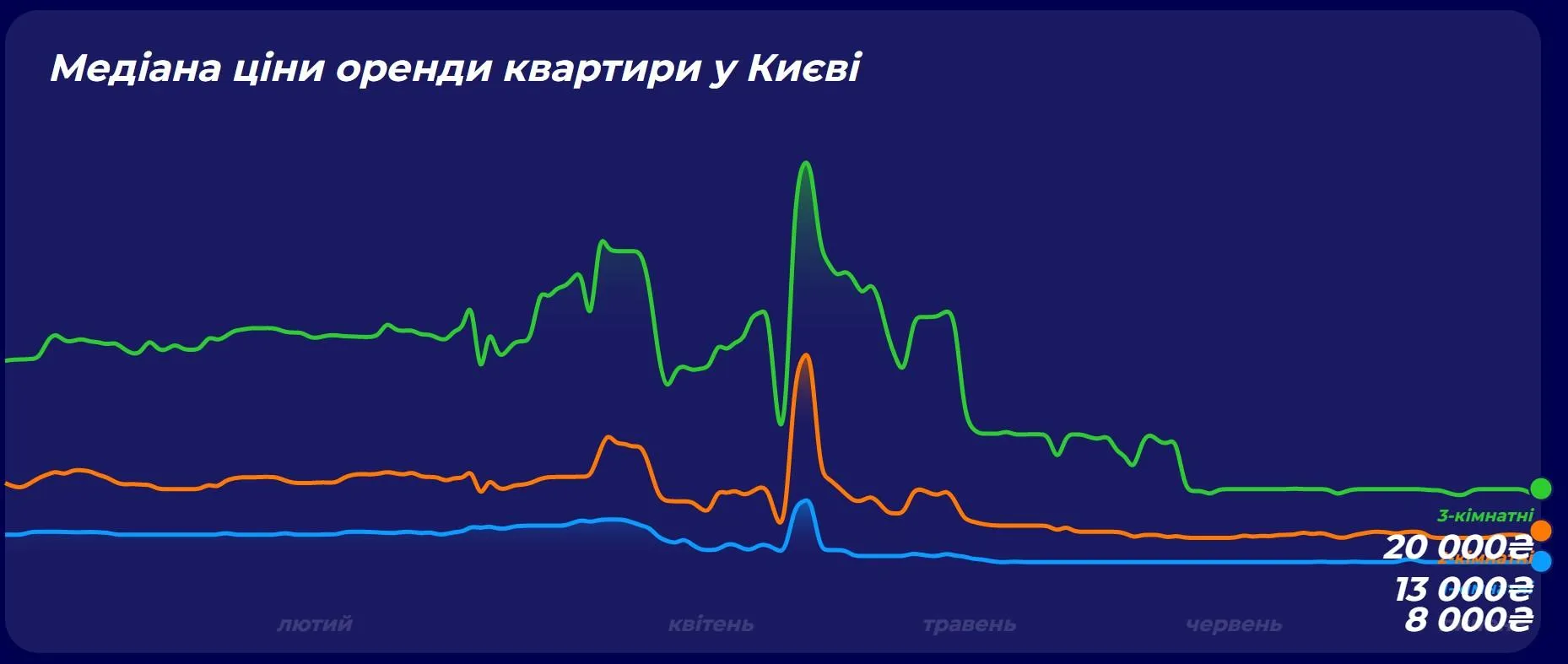 - 1-кімнатні: ціна знизилася 13 000 до 8 000 гривень (падіння на 38%);
