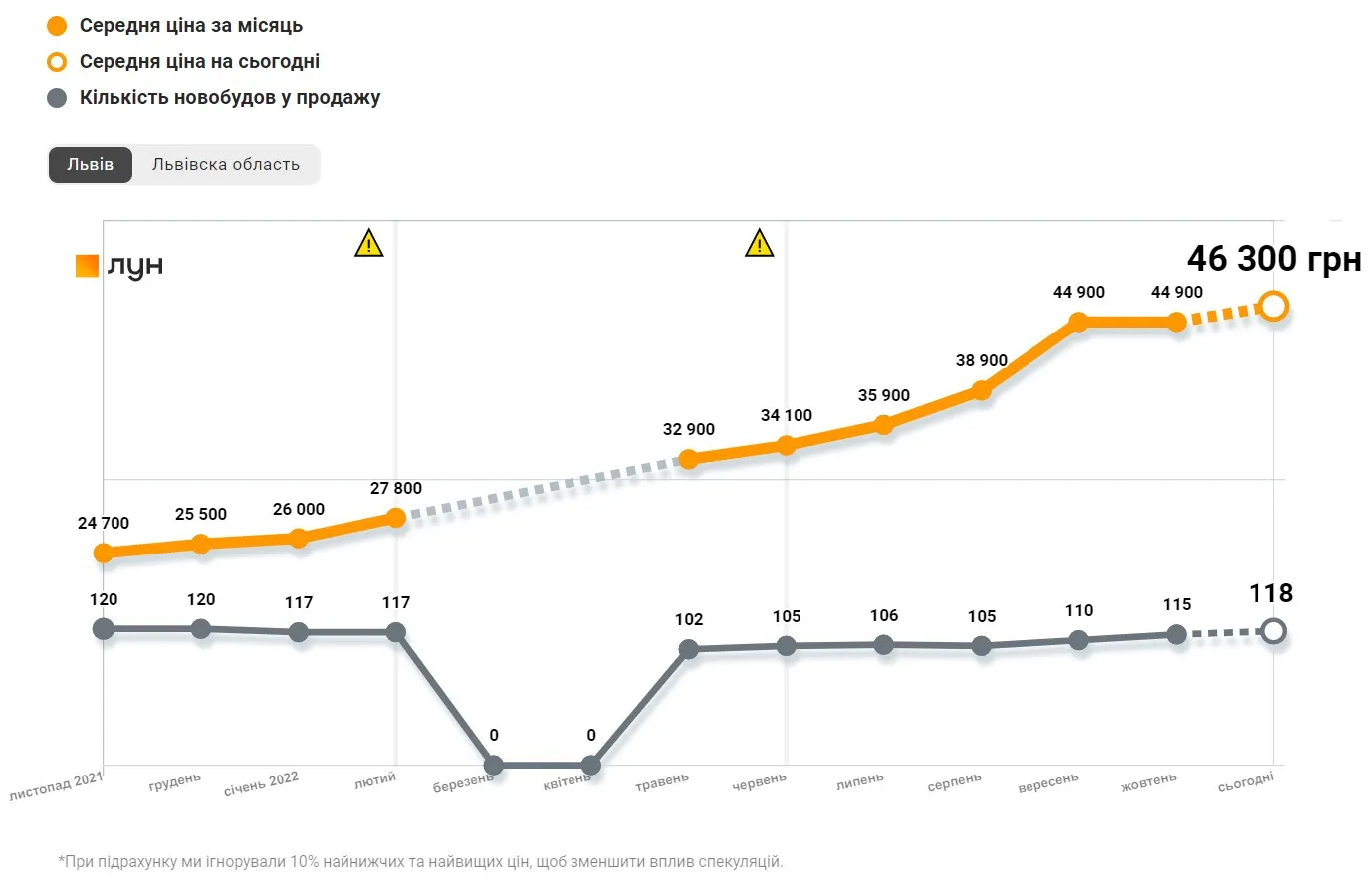 Схожа ситуація спостерігається і в області. Сьогодні квадратний метр в новобудовах коштує 36 400 гривень, а на ринок повернулися 217 новобудов, що майже наздоганяє показники лютого.