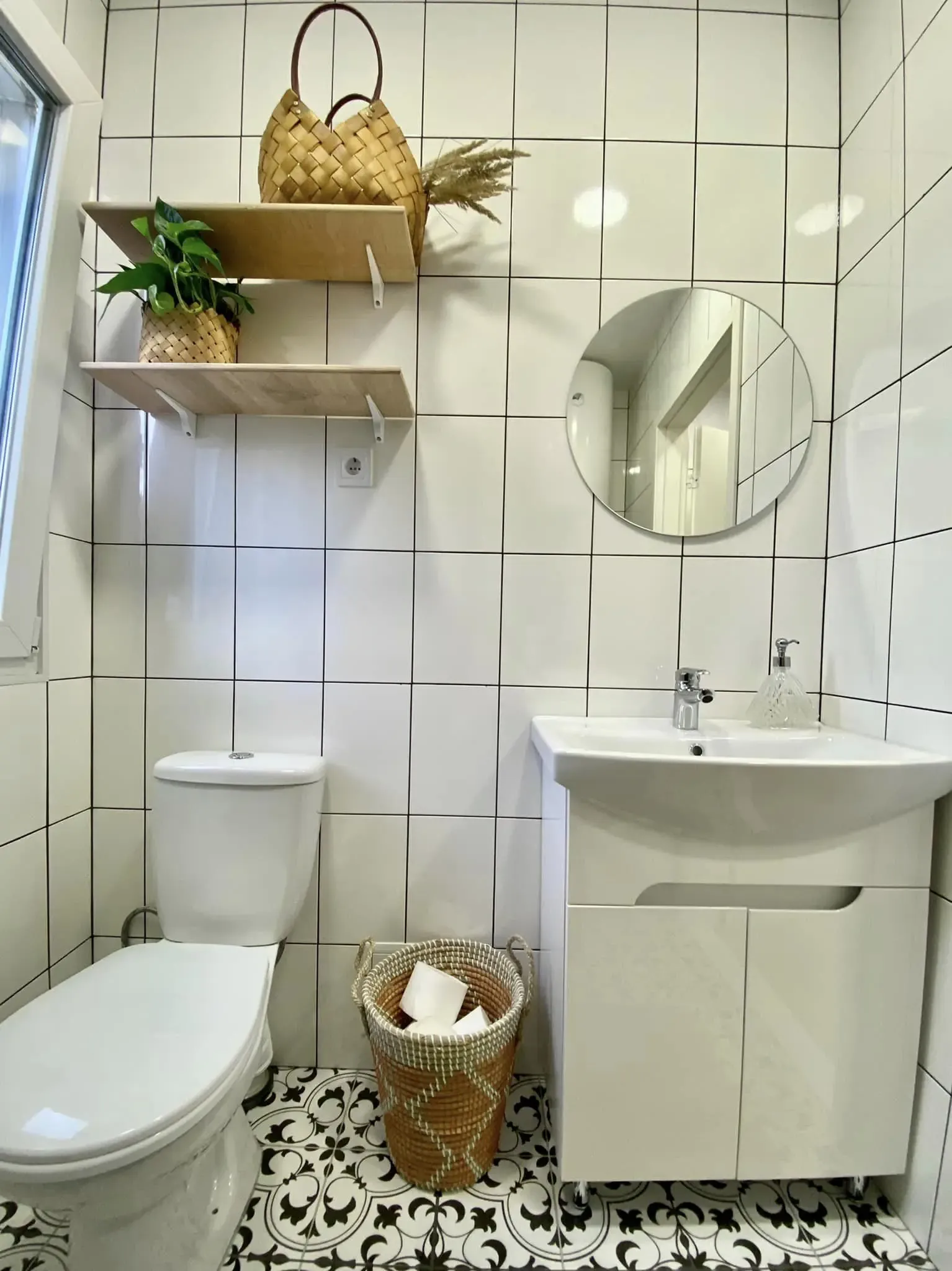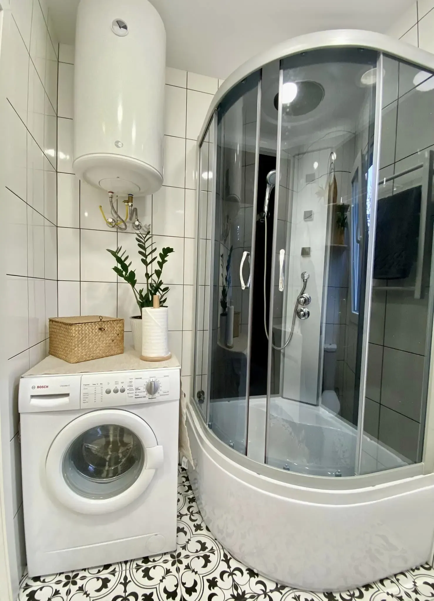 У ванній кімнаті є душова кабіна, підлога з підігрівом, вмивальник з тумбою, унітаз, пральна машина, бойлер, рушникосушка.
