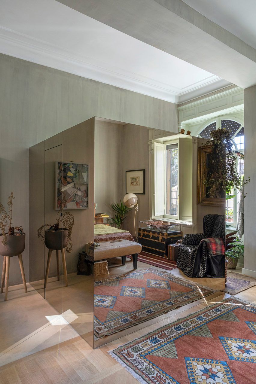 В квартире множество антикварной мебели, которая сочетается с современными дизайнерскими изделиями. А яркая палитра стен контрастирует с деревянным полом.