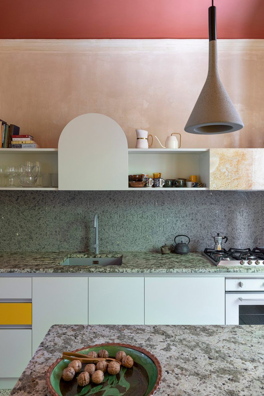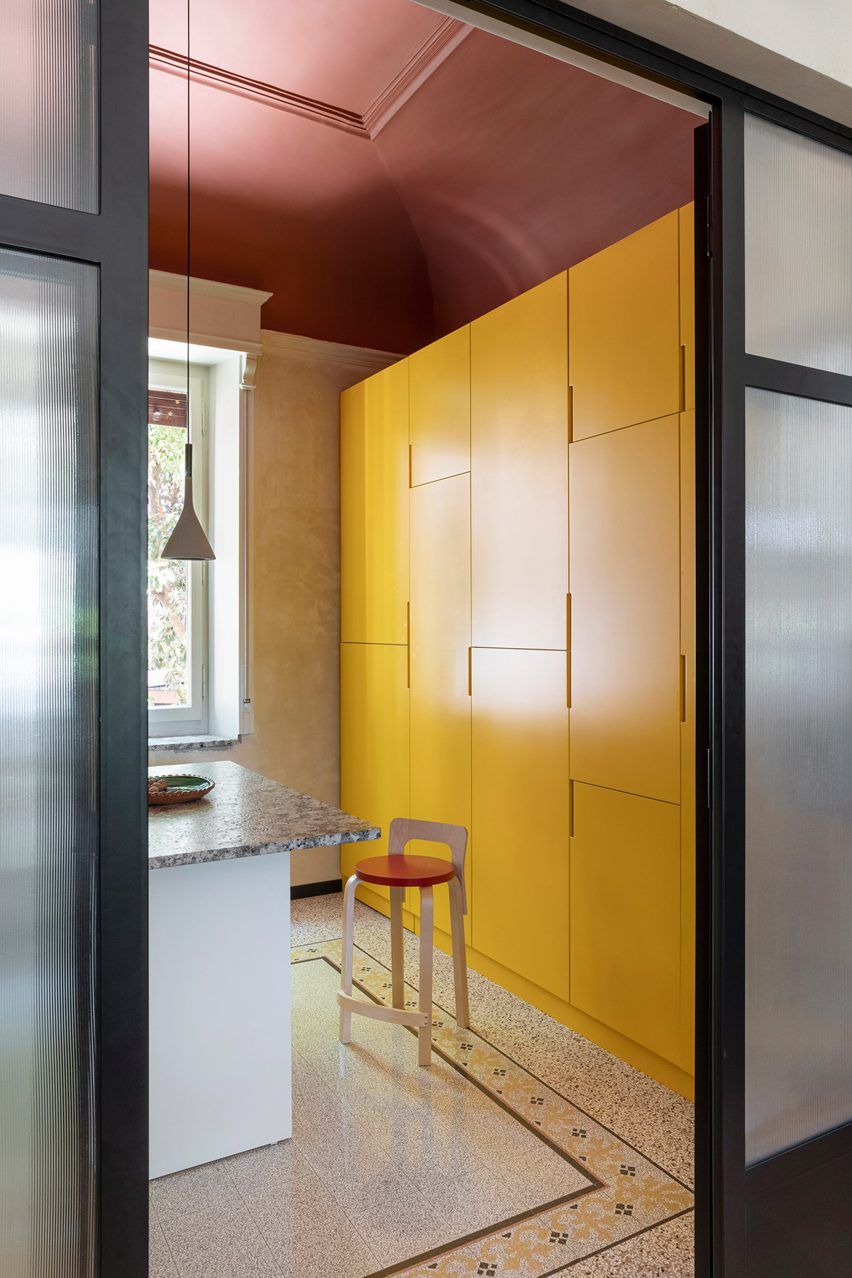 Главной особенностью этой квартиры в Мадриде стал пол, который визуально разделяет гостиную, кухню и санузел. Яркая плитка используется также на фасаде кухни.