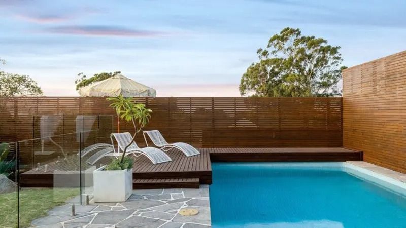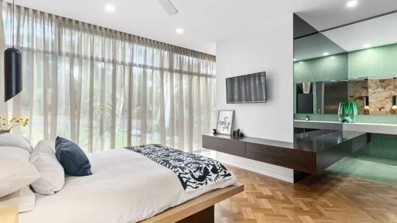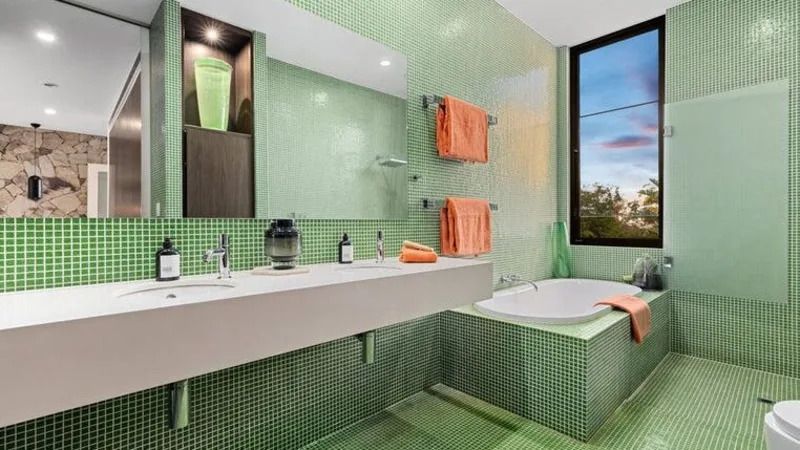Современный камин в каменной стене между кухней и гостиной, украшенная зеленой плиткой ванная комната в главной спальне и магниевый бассейн с террасой – одни из особенностей этого жилья.