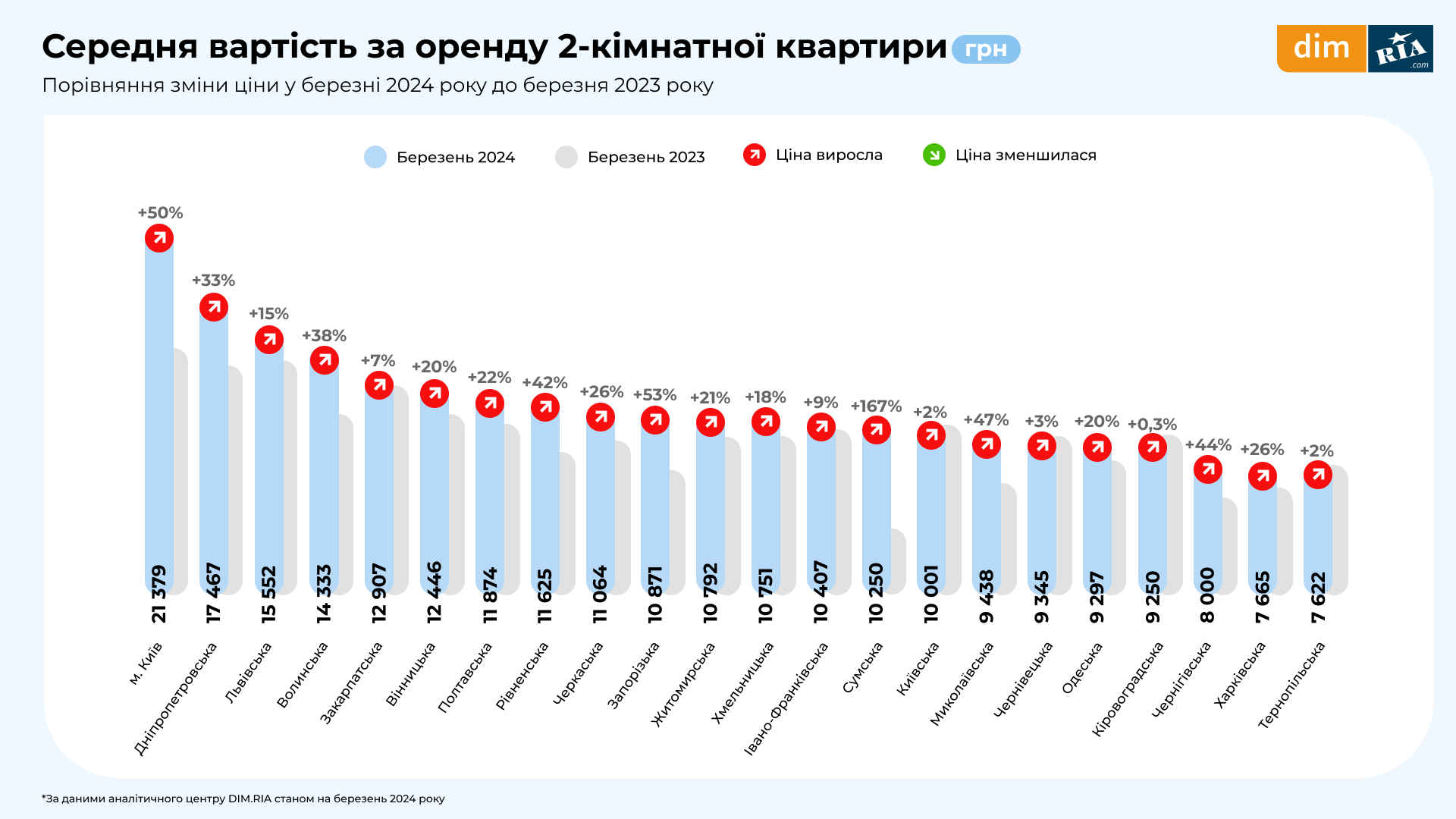 Цены на аренду двухкомнатных квартир также подскочили во всех областях Украины (данных об оккупированных территориях и тех, где продолжаются активные бои, нет). Лидеры по росту цен: