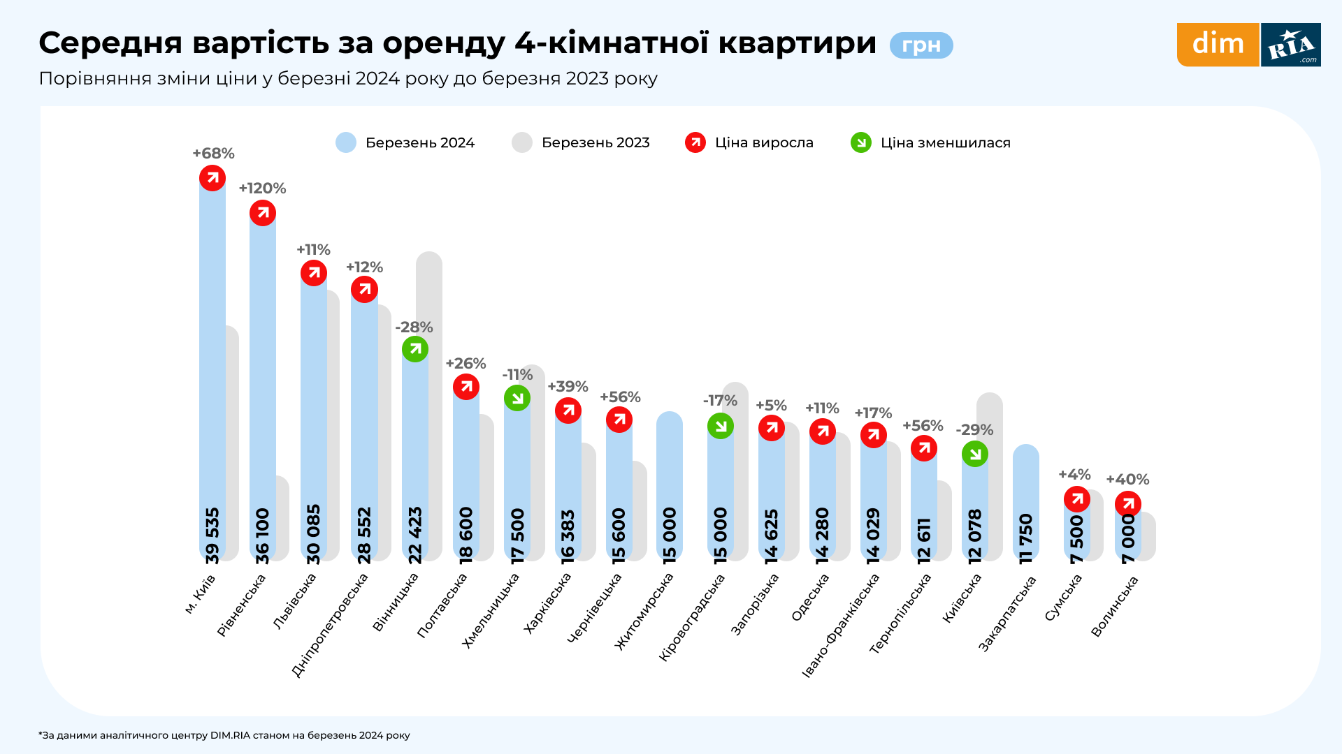 Арендная плата за четырехкомнатные квартиры существенно снизилась в Киевской (-29%) и Винницкой (-28%) областях.