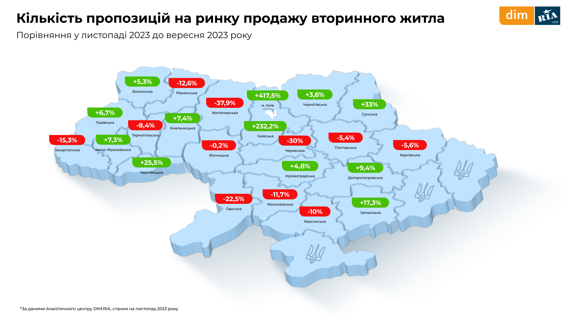 В течение осени 2023 года предложение продаж на вторичном рынке недвижимости росло. В Киеве и области количество объявлений увеличилось в разы. Если сравнивать с сентябрем 2023 года, предложение заметно уменьшилось в Черкасской области на 30% и в Житомирской области на 38%. Вторичный рынок недвижимости осенью проанализировали аналитики маркетплейса DIM.RIA, сообщает 24 Канал.