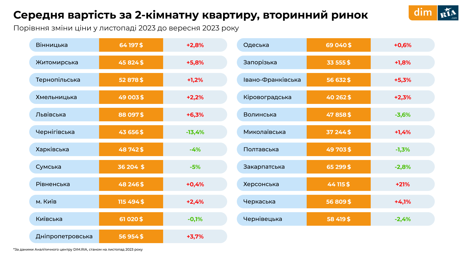 На вторичном рынке в ноябре средняя цена однокомнатной квартиры в Киеве составила 89475 долларов США. Если сравнивать с сентябрем, то цена выросла на 3%. На второй строчке по стоимости однокомнатной квартиры оказалась Львовская область и цена составляет 66 552 доллара США.