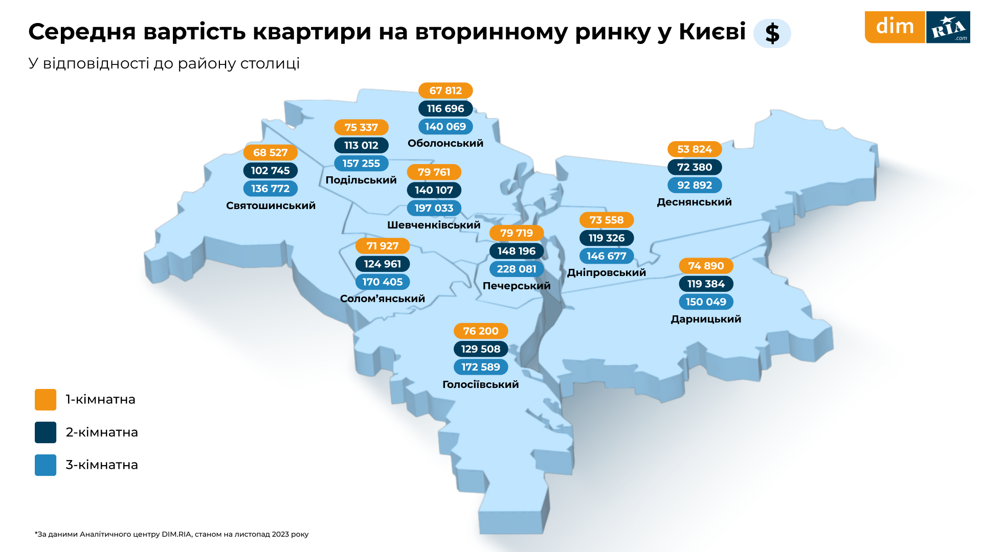 Если анализировать стоимость в разных районах Киева, то самая средняя цена хранится в Шевченковском районе – 79 761 доллар США за однокомнатную квартиру. Наименьшая стоимость в Деснянском районе – 53 824 долларов США.