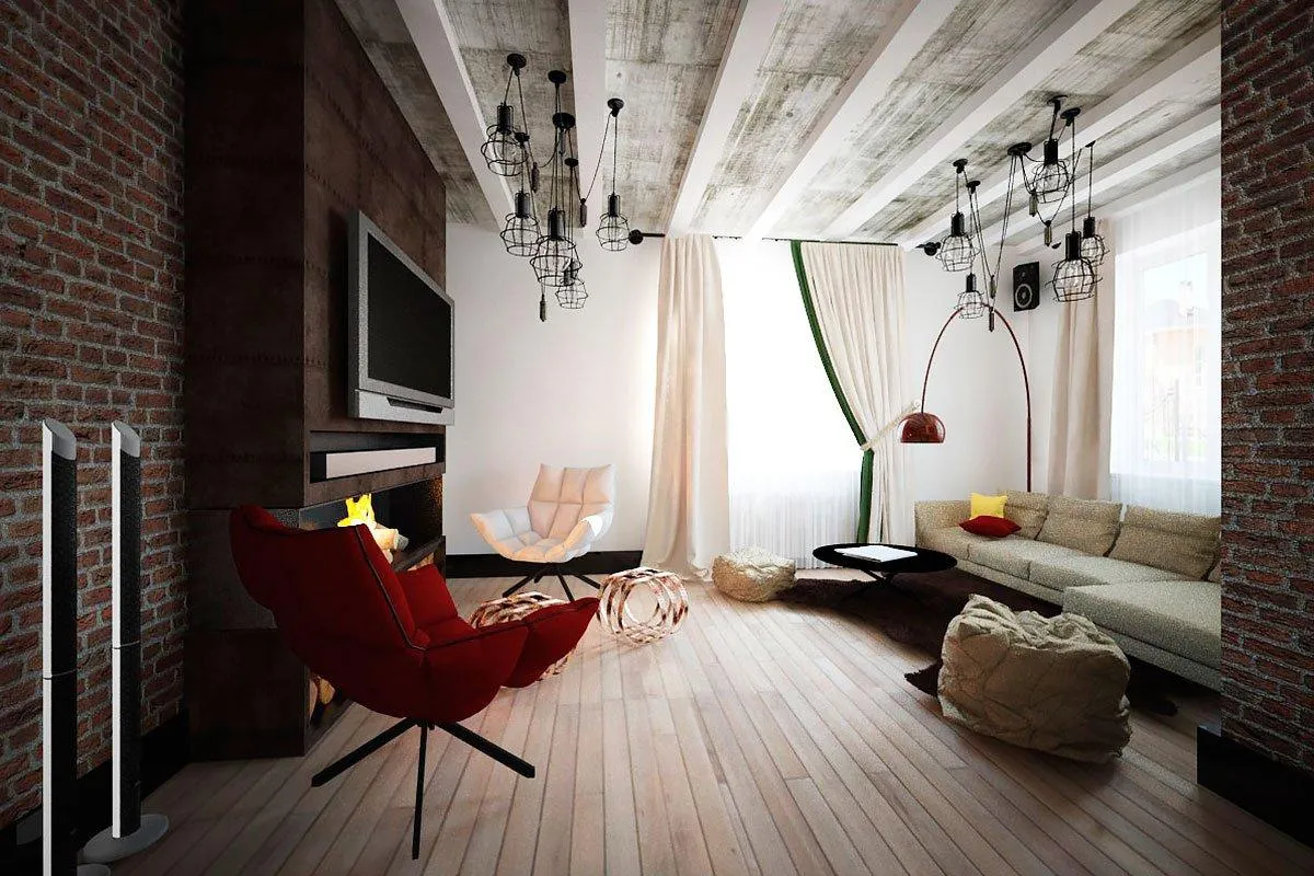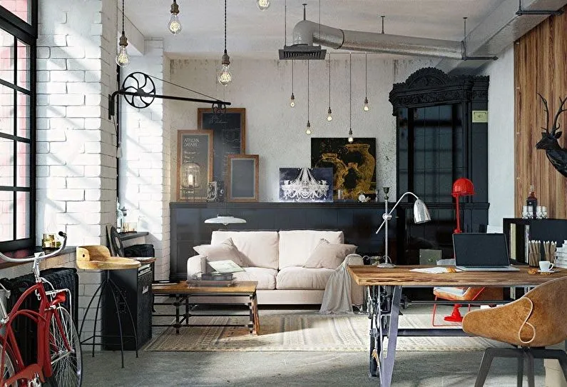 - Основные элементы – кирпичная кладка, грубая штукатурка, оголенные стены, коммуникации и проводка без маскировки.