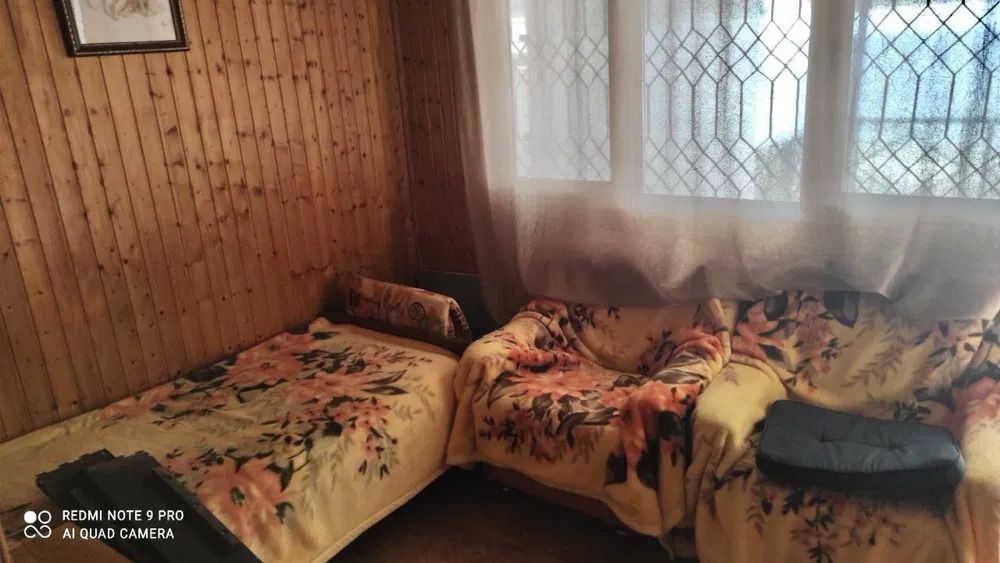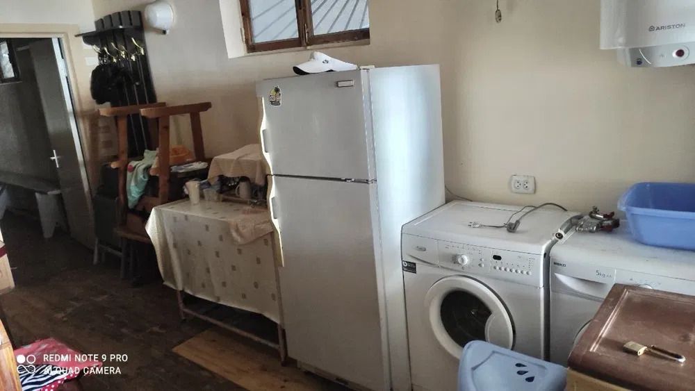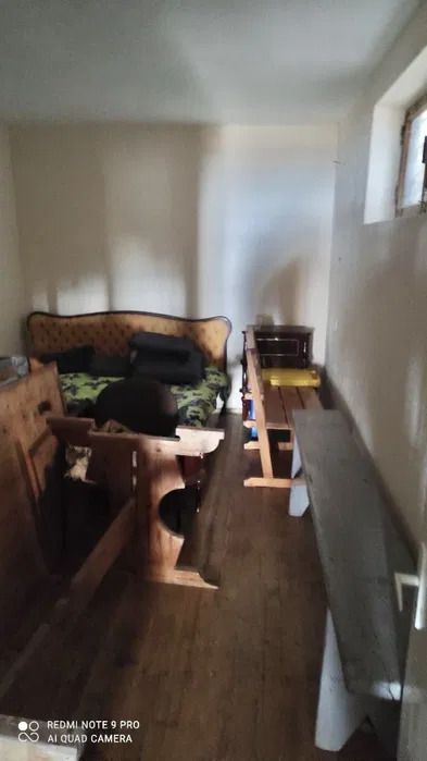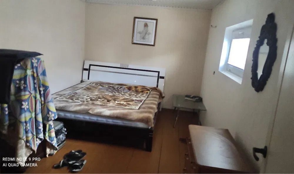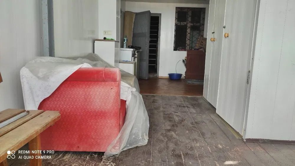 На фото видно спальню с кроватью и двумя столиками и комнату с кроватью и двумя мягкими креслами. Также показали довольно загроможденное помещение, где размещена кухонная и стиральная зоны. Дом продают вместе с мебелью, хотя некоторые из них уже старые.