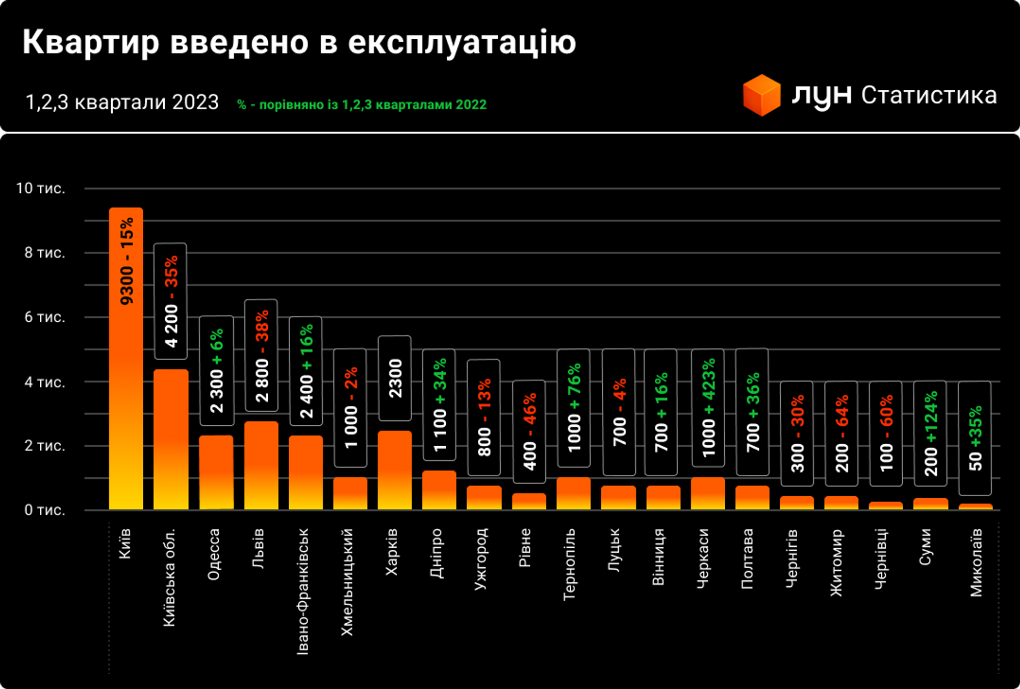 Хотя в первом квартале 2023 года темпы ввода жилья в эксплуатацию равнялись показателям 2019 года, за три квартала текущего года в эксплуатацию было введено ощутимо меньше жилья, чем в 2022 году. Так, в столице зафиксировано снижение на 15%, в Киевской области – на 35%, в Днепре – на 34%, во Львове – на 38%.