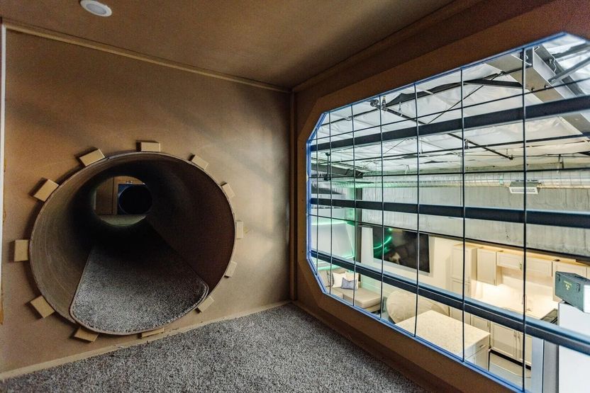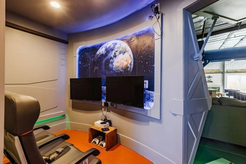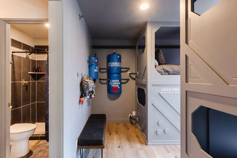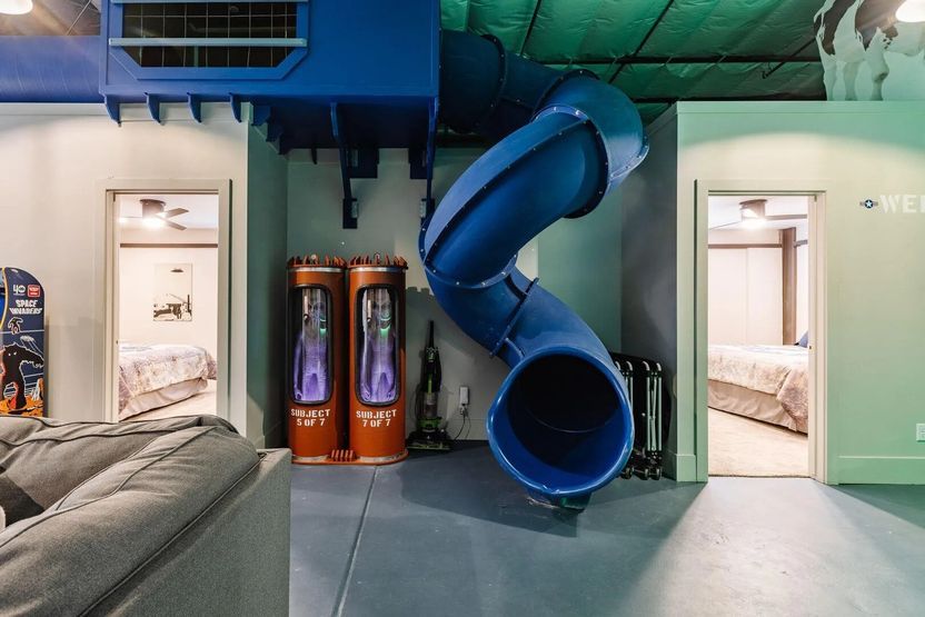Двухъярусная комната создана для еще большей творческой игры, а места для сна оформлены в виде футуристических криогенных контейнеров. И даже притворные пришельцы в сидящих рядом гигантских пробирках имеют особую историю.