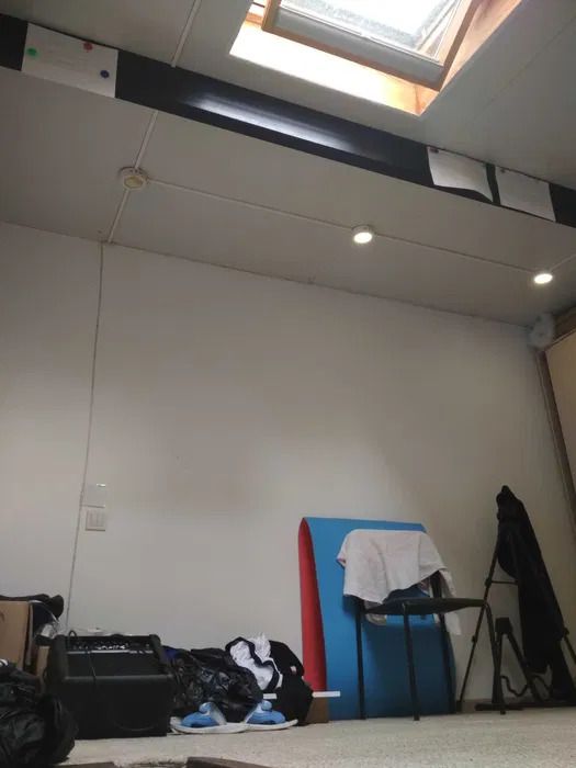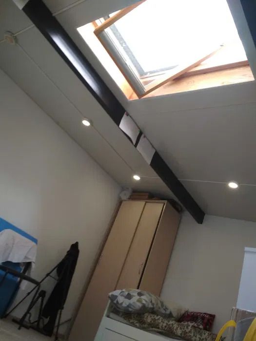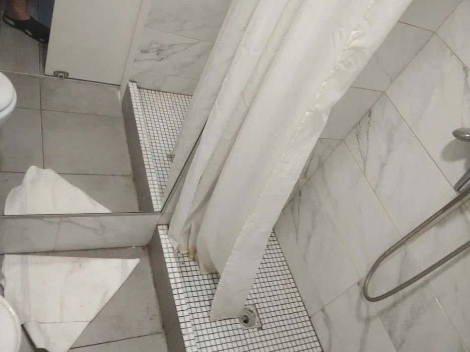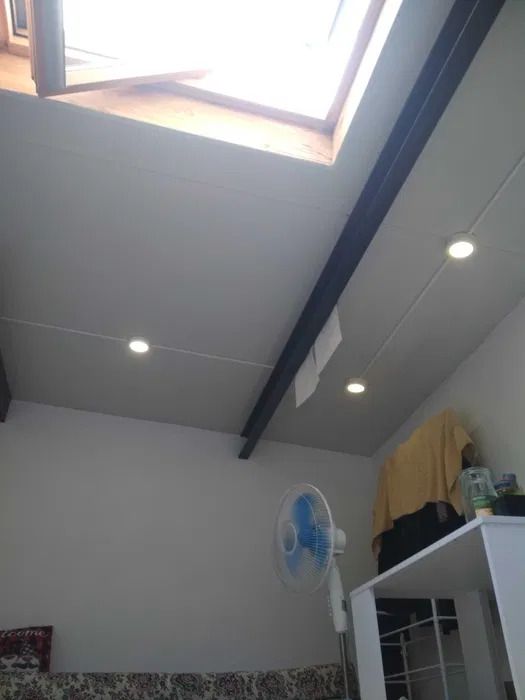 Внутри есть одна комната с кроватью, шкафом, столом и холодильником. В описании указано, что есть также стиральная машина. Также отдельно есть душ и туалет, что расположен на нижнем этаже. Очевидно, он является общим.