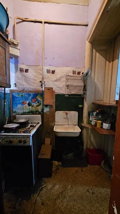 Помещение расположено на последнем этаже 3-этажного дома. Общая площадь жилья составляет 22 квадратных метра, из которых кухня занимает 4 квадрата. В квартире нет не только ванной комнаты, а даже туалета, – он расположен в коридоре.