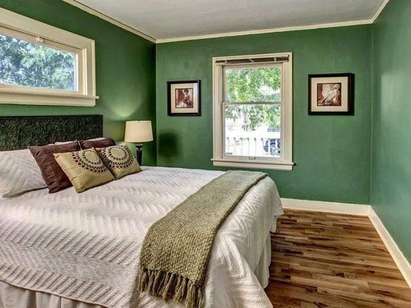 Этот цвет ассоциируется с покоем и здоровьем. Его оттенки снимают стресс и позволяют наслаждаться отдыхом. Для спальни лучше использовать приглушенные тона. Они прекрасно сочетаются с белым, бежевым и серым цветом.