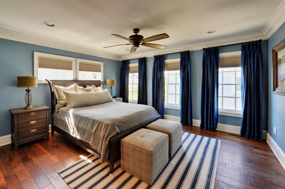 Оттенки синего цвета ассоциируются с морем и чистым небом, создают уют и тепло в спальне. Используются как насыщенные, так и пастельные тона синего цвета.