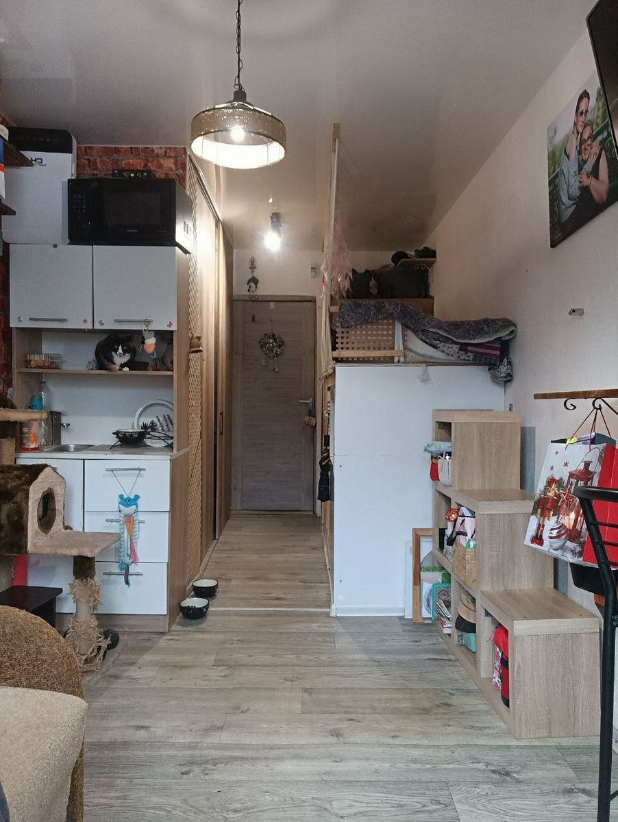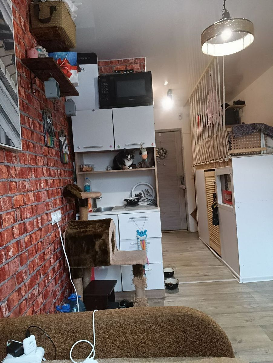 Планировка – студия, в ней размещены спальные зону, кухонную зону, душевую кабину, холодильник, стиральную машину автомат. Есть встроенный гардероб,