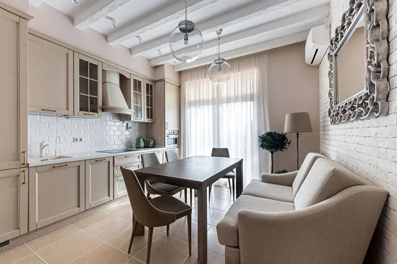 Длинный диван-книжку можно поставить на кухне. Это позволит разместить двух гостей. Важно учесть, что в таком варианте стол должен быть короче, чем диван, а стулья лучше подобрать с мягкой обивкой – тогда интерьер будет выглядеть целостно.