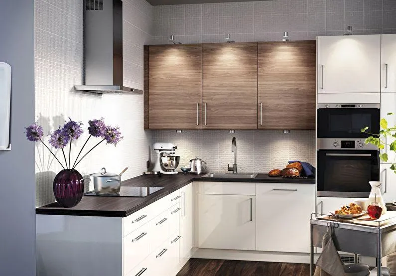 - Г-образная (угловая) – самая распространенная планировка. Этот вариант подходит для большинства помещений, поэтому пользуется большой популярностью среди владельцев жилья. Г-образная кухня позволяет разместить все необходимое рядом и при этом не "съедает" лишнее пространство.