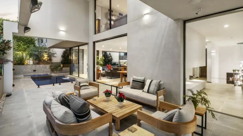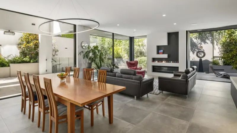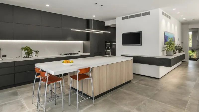 На нижнем уровне расположен гараж на четыре машины и резиденция-студия, где находится спальня, ванная комната, гостиная, кухня со стиральной и отдельным входом. Это идеально для обитания нескольких поколений.
