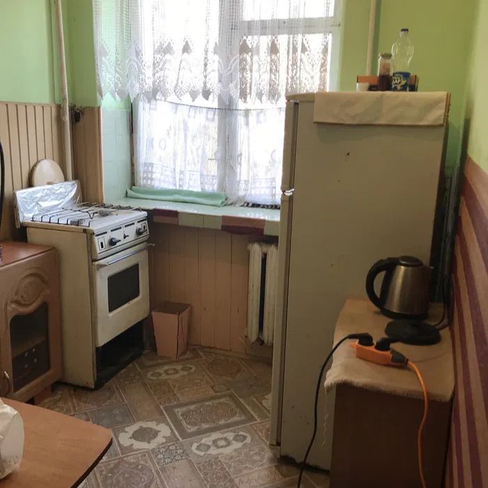 В комнате есть два спальных места, шкаф, стол с креслами, тумба и телевизор. На кухне есть тумбы с рабочими поверхностями, плита, холодильник и чайник. В самом плохом состоянии ванная комната – плитка на стенах и полу начинает облуживаться.
