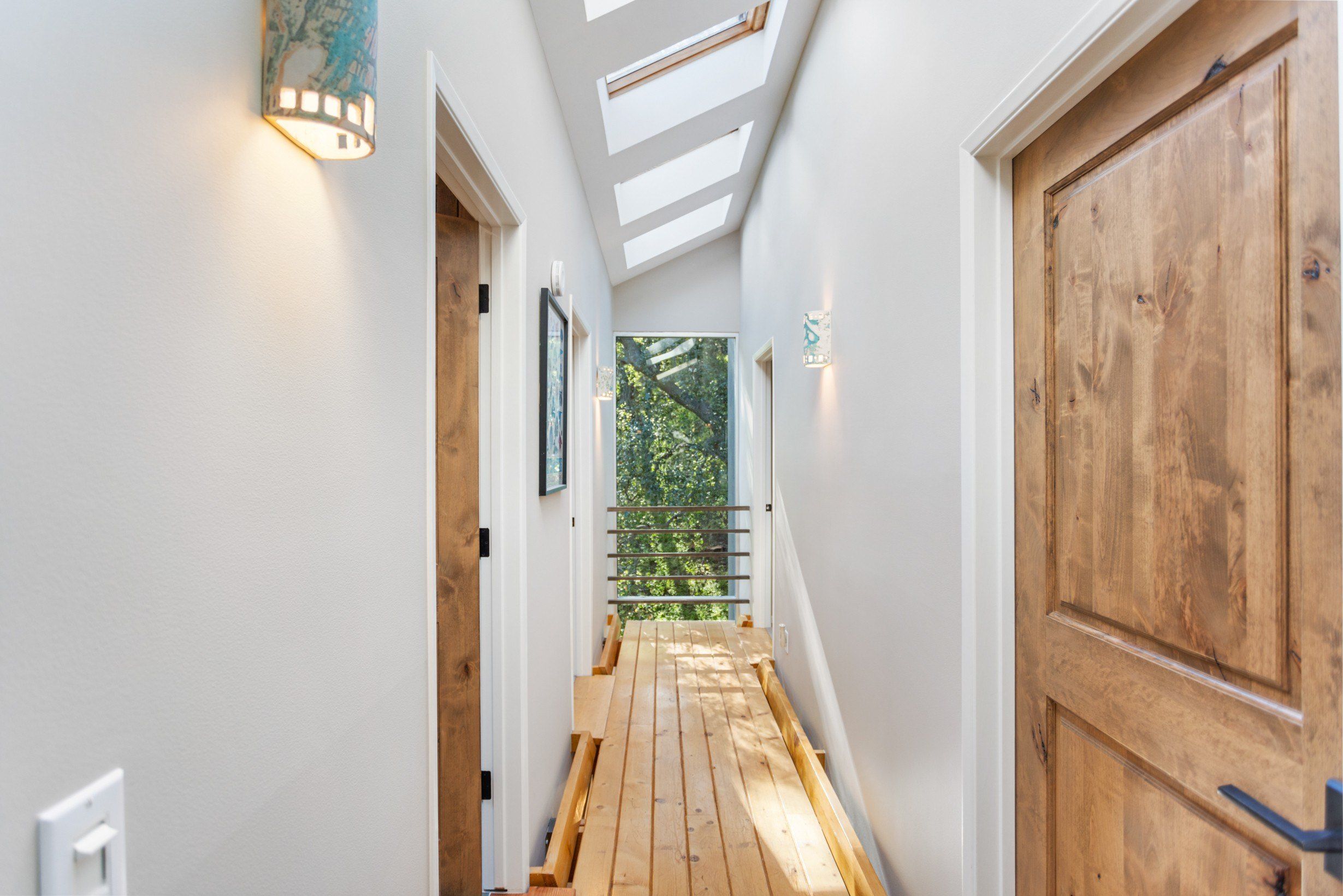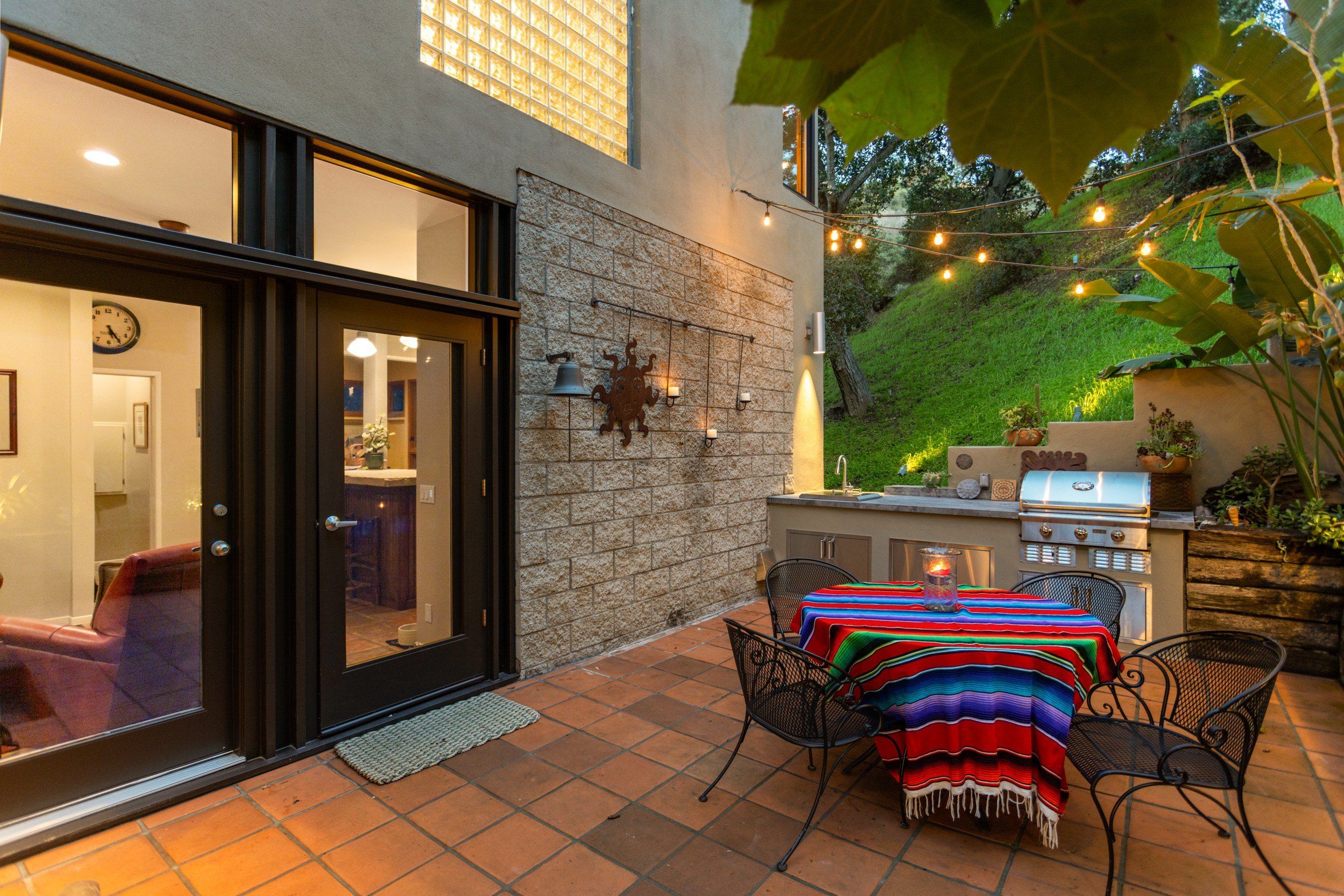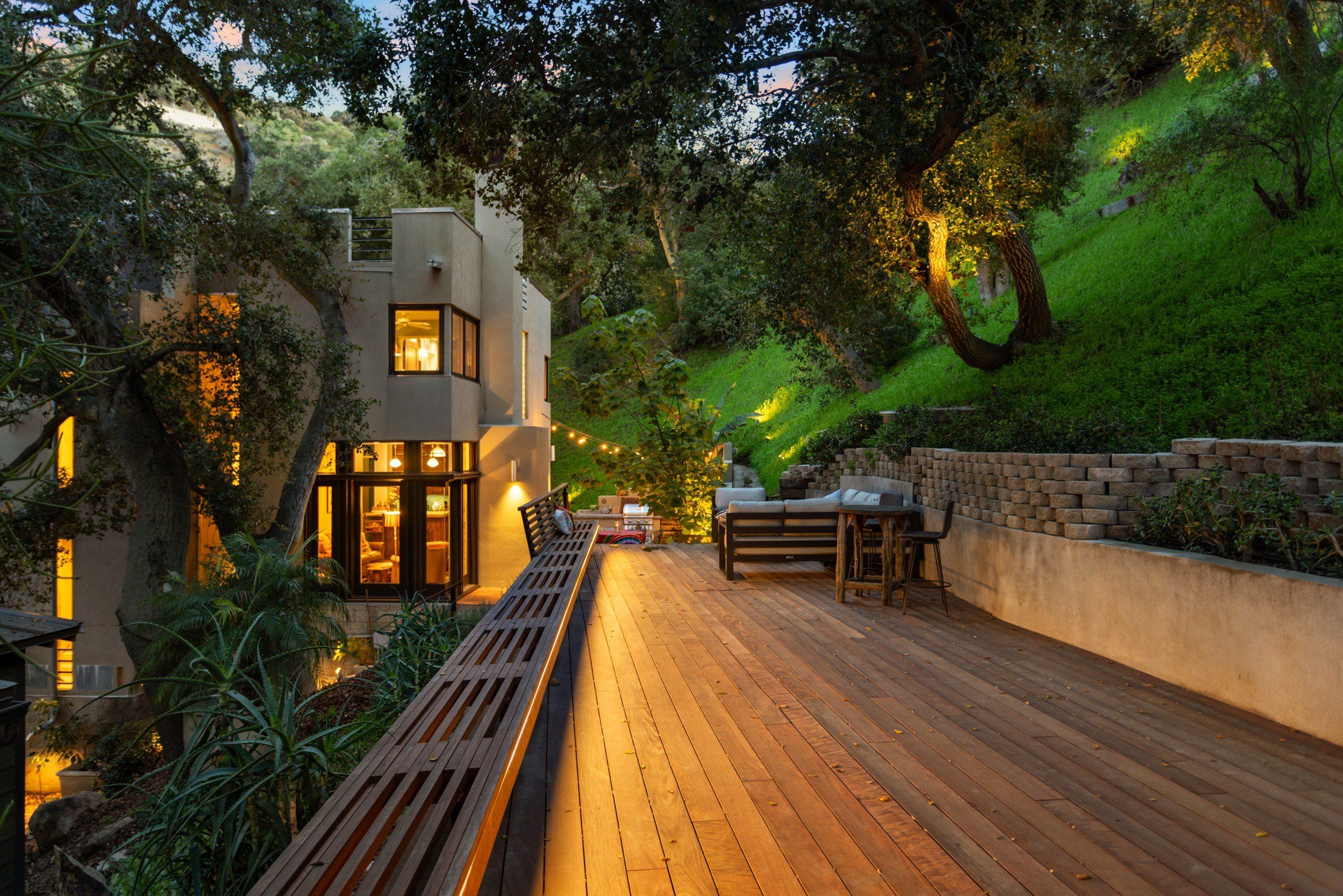 Ванная комната на верхнем этаже выполнена в стиле спа. А теплая гостиная с панорамными окнами предлагает невероятные виды на горы и дубовые рощи.