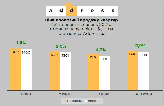 В августе 2021 средняя цена предложения квартир на вторичном рынке Киева, увеличилась по сравнению с июлем на 2,9%, и составила 1346 долларов за квадратный метр.