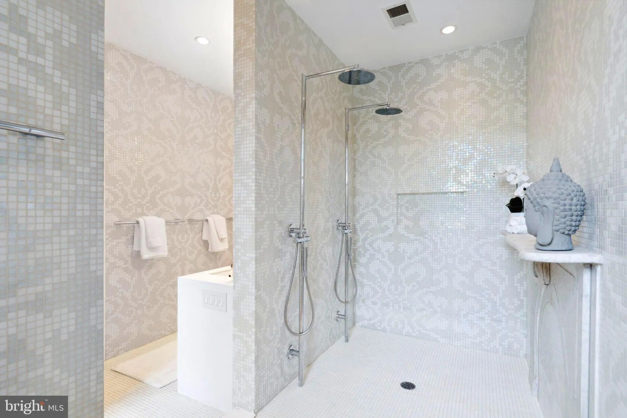 Красота дома проявляется в маленьких деталях, таких как окна из свинцового стекла и итальянская мозаичная плитка Bisazza, которая устилает душевую кабину.