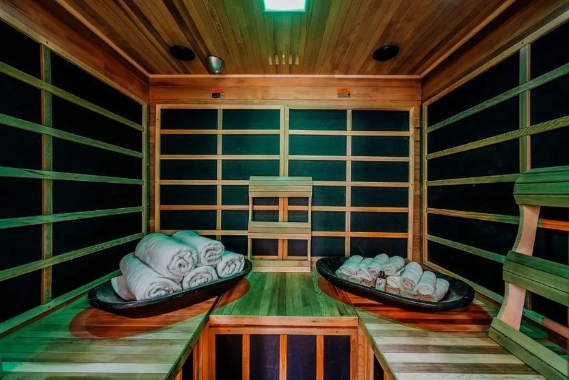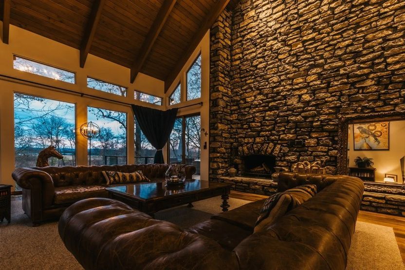 В доме есть две спальни с отдельными ванными комнатами. Они расположены на главном этаже вместе с просторной гостиной со стеклянными стенами. Также в помещении есть зона для проведения мероприятий в стиле лофт, современная кухня с выходом на патио, два офиса, домашний бар и сауна.