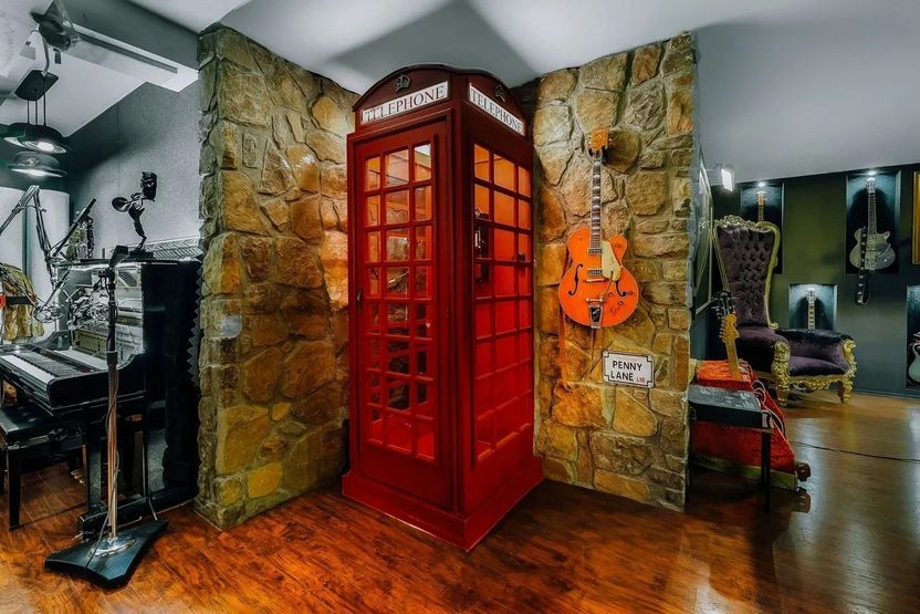 По стенам в студии много ниш с подсветками, где хранятся гитары. Продавцы даже "украсили" помещение культовой красной телефонной будкой из Лондона. "Владельцы из Англии, поэтому телефонная будка будто отдает дань их корням", – говорит агент по продажам.