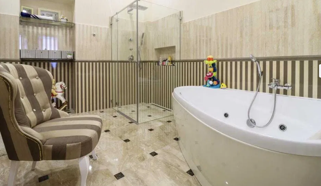 З опису відомо, що у квартирі чотири санвузли, один великий балкон, дві кладовки, індивідуальне опалення. Квартира з дизайнерським ремонтом та меблями розташована на третьому поверсі з чотирьох. У вартість квартири входить місце в підземному паркінгу.