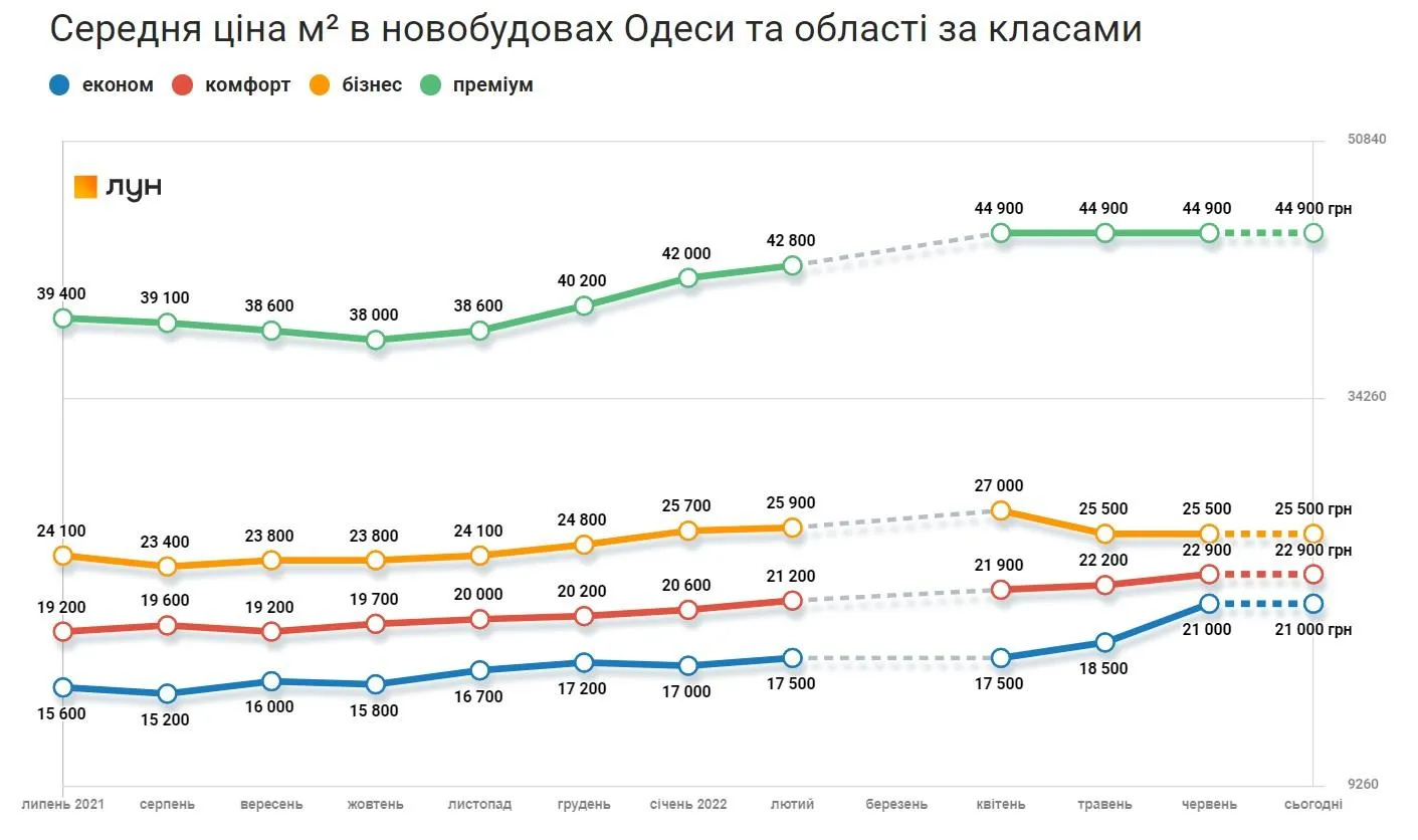 Південний регіон, а саме Одеська область, після невеликого просідання у попередні місяці повернулась до лютневих цін. В розрізі різних класів житлових комплексів, експерти зазначили, що навіть спостерігається несуттєве зростання на найдоступніші економваріанти.