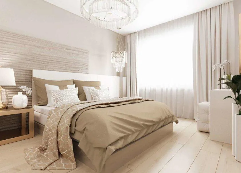 Мабуть, найтепліше, найніжніше і найуніверсальніше поєднання. Цей варіант зробить спальню максимально затишною і створить атмосферу релаксу. А якщо ви захочете чогось яскравого – можна додати кілька контрастних акцентів (наприклад, кілька подушок або ваз). Важливо: подібний колірний варіант – поза модою і завжди актуальний.