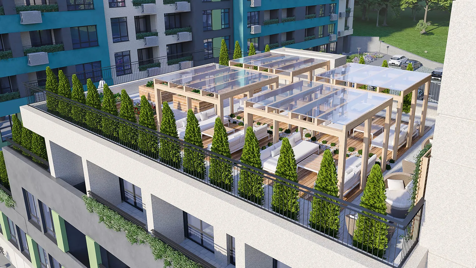 На даху одного з будинків буде розташовано унікальний лаунж-простір, звідки відкриватиметься панорама печерських пагорбів.