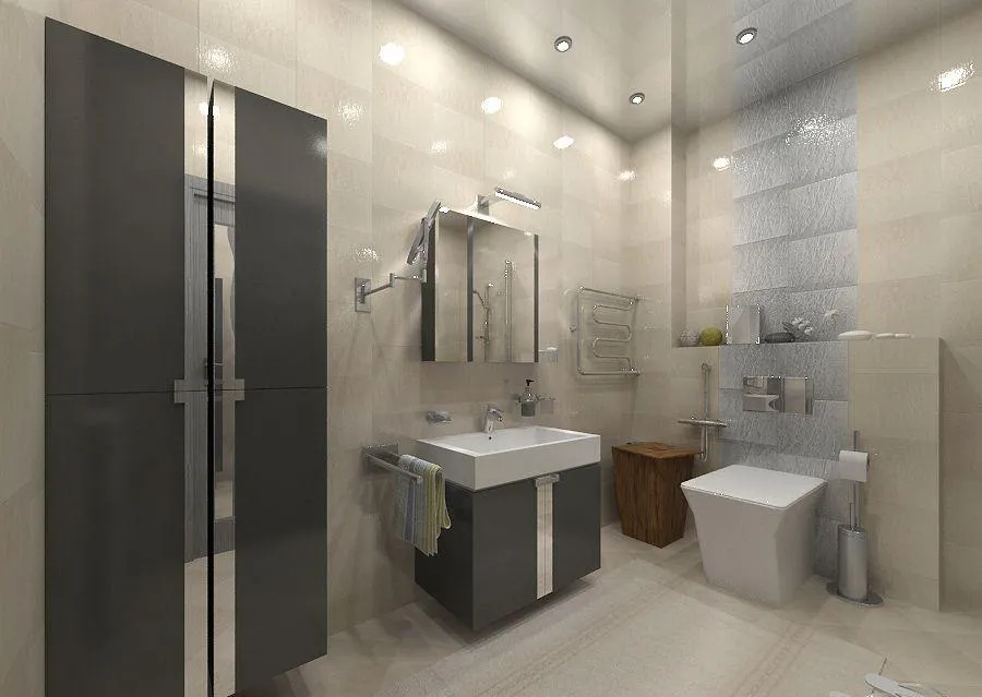 - Різнобарвним (від трьох до шести кольорів і відтінків. Наприклад, сірий кахель, сніжно-біла сантехніка і світло-молочна і ніжно-кремовий меблі або аксесуари).