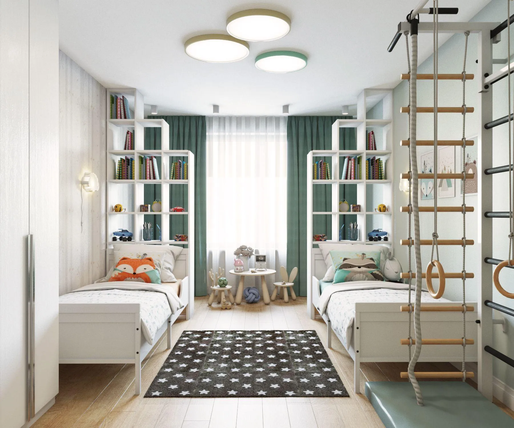 Дитяча для двох – це не лише момент ергономіки, але і психології, щоб дітям було комфортно поруч один з одним. До речі, деякі психологи стверджують, що для близнюків двоярусні ліжка не підходять, оскільки один бачитиме батьків на рівні очей, а інший – ні, і це викличе ревнощі... Тут, я вважаю, що ви повинні орієнтуватися по своїх дітях, а, можливо, перед ремонтом порадитися з ними і навіть подивитися картинки,